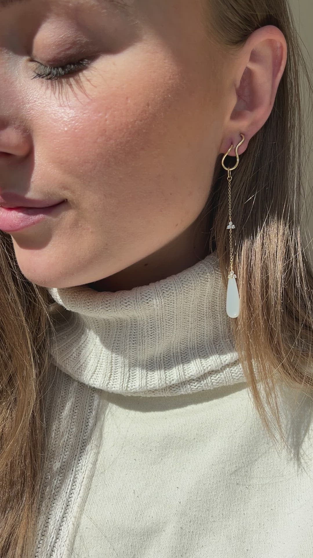 Langt guldvedhæng med smuk hvid månesten og glimtende diamanter.