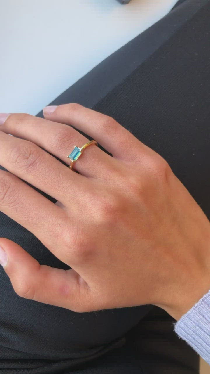 Sat med en smuk grøn/blå 0,35ct baguette-sleben turmalin samt