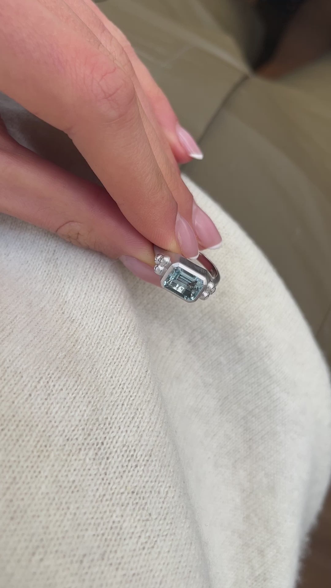 Ringen er fremstillet i 18kt rødguld sat med 7 brillanter i alt 0,093ct TW.VS & 2.90ct oktagon sleben akvamarin.